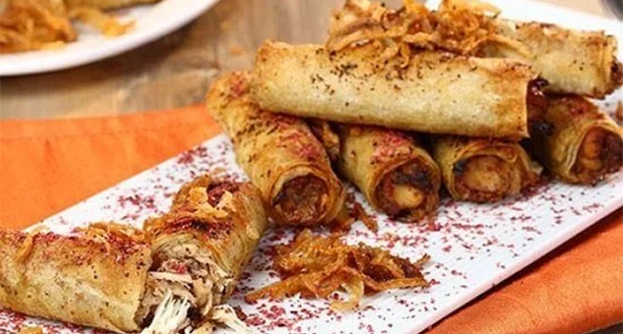 Chicken cooked with onions and sumac, wrapped in saj bread and toasted.