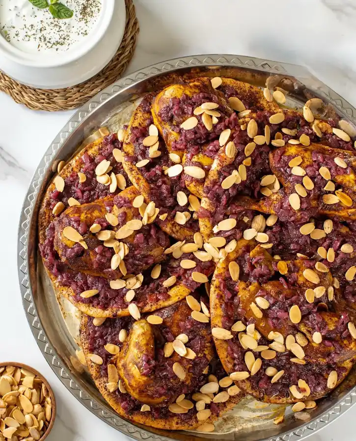 Traditional taboon bread topped with olive oil–sautéed onions, seasoned chicken, sumac, and toasted nuts.