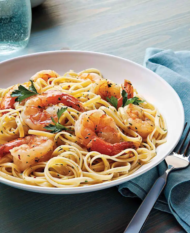 Shrimp cooked in garlic butter sauce, served with pasta or bread.