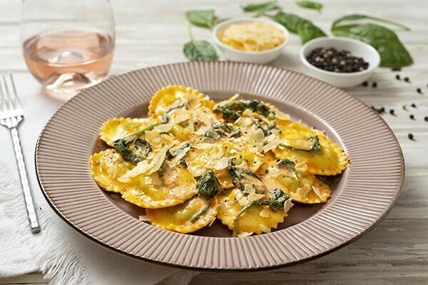 Ravioli stuffed with spinach and ricotta cheese, served with tomato or cream sauce.